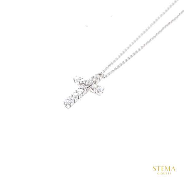 Woman necklace Crivelli Jewels. Necklace and pendant in the shape of a cross in 18 kt white gold set with diamonds ct 0.35, G color, SI clarity, brilliant cut. The weight of the gold is 3.5 gr. The dimensions of the cross are: length 2 cm., width 1.1 cm. The length of the necklace is 43 cm., you can also adjust it to a length of 40 cm because there is a second gold ring where to hook the carabiner. Jewel code: 78443.