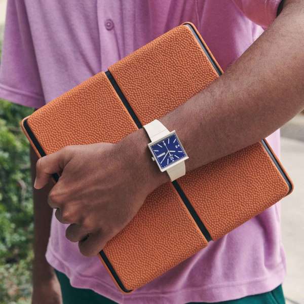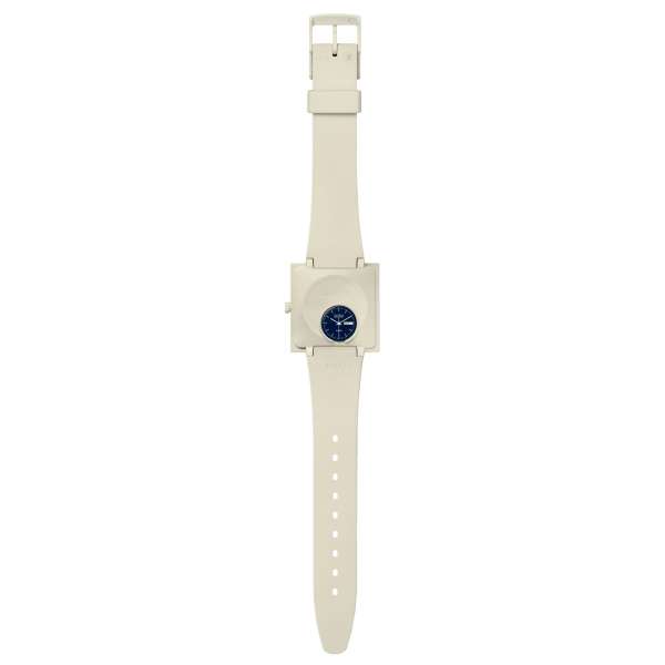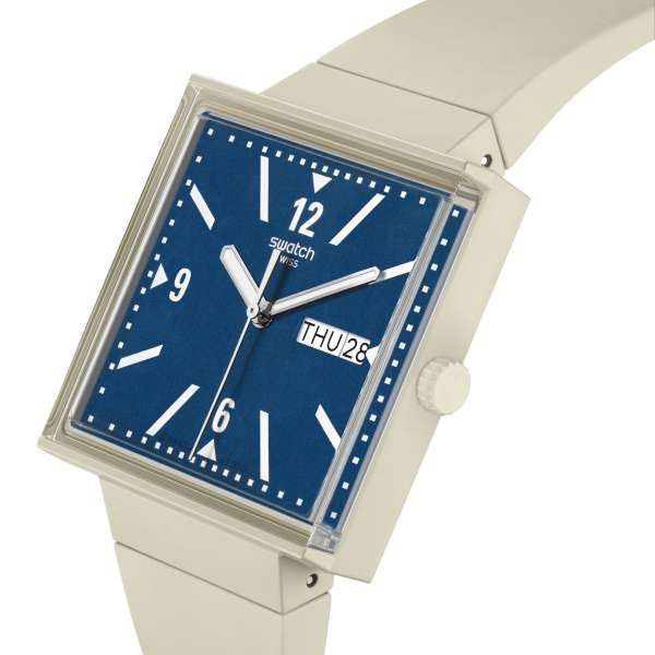 Swatch What If Beige men's watch from the Bioceramic What If collection. Analogue watch with Swatch Swiss calibre with three hands: hours, minutes and seconds. Beige Bioceramic case, square in shape, diameter is 41.80 mm and thickness is 10.50 mm. Square dial with silver phosphorescent hands, day of the week and day of the month date display at 3 o'clock and Swatch logo prominently displayed at 12 o'clock. Watch with edge-to-edge biosourced glass that allows a side view of the watch hands with Arabic numerals. The printed battery cover on the back depicts a view of the watch face. The strap is beige silicone with a buckle fastening. Water resistance of 30 metres. Watch code: So34t700. Swiss made.